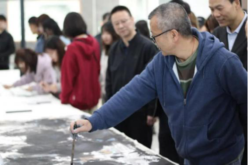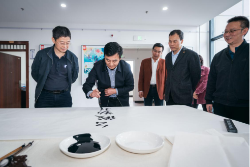 王亚杰书记、吕建荣副书记、田明纲部长及职能处室领导参观环境艺术工作室、丝网印工作室,并通过丝网印刷的方法参与作品制作。