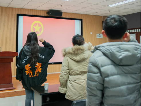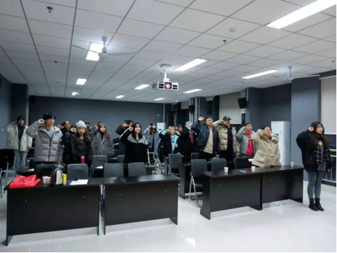 报告结束后,本学期发展的新团员参加了入团仪式,在团旗下进行入团宣誓。本期青马班学员与其一同高举右拳,在王文哲同学的领誓下,重温入团誓词。