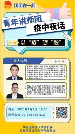 鼓舞团学青年,凝聚更大青春力量助力早日夺取疫情防控战役的胜利。1月3日和1月12日晚,世界杯官方网站入口2026青马分校组织第三期青马学员参与由2026世界杯官方网址团委和西安航空公司团委共同开展的青年讲师团示范课之“团团在一起”疫中夜话—以“疫”砺“毅”讲座和“以睿智和德雅共克时艰”讲座。讲座分别由苟昭赟老师、陈露老师和齐钊老师主讲。