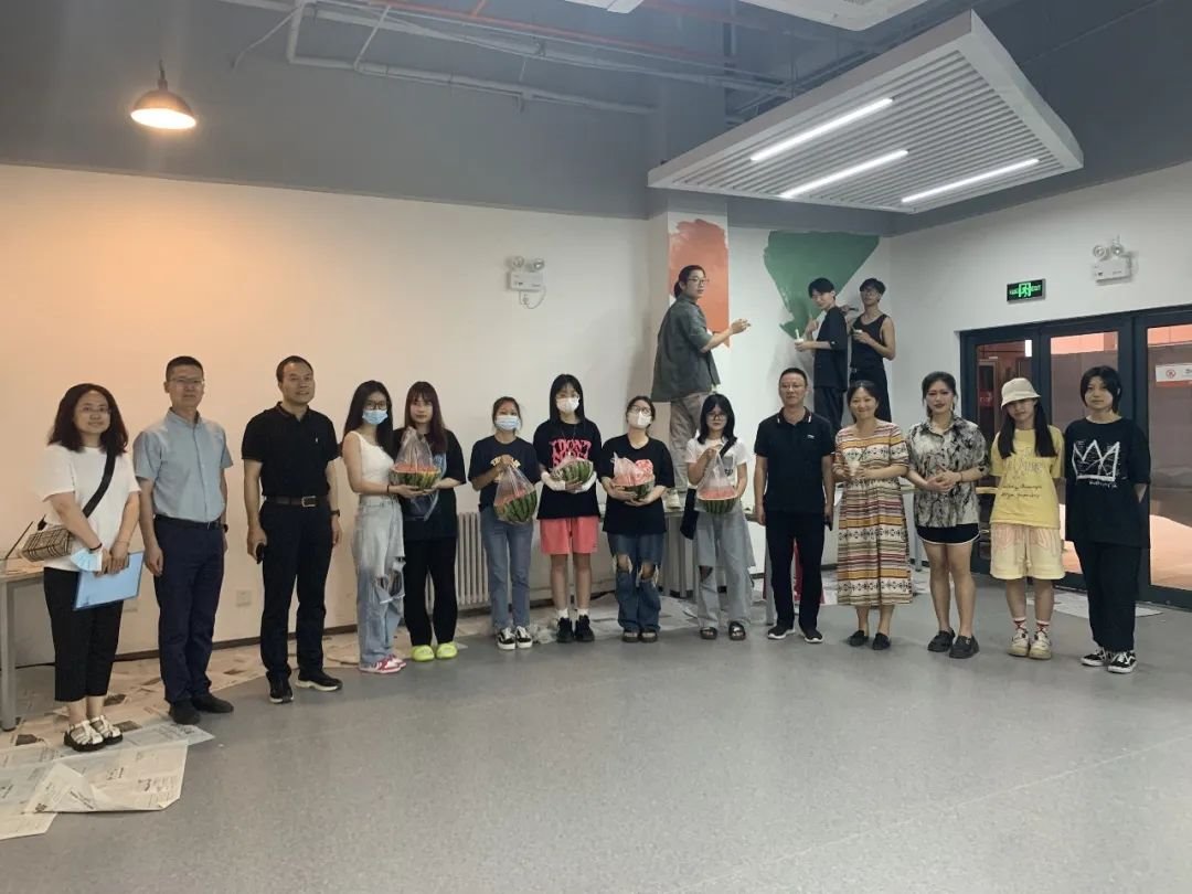 6月14日下午,公司党委副书记吕建荣一行来到公司“三创”空间孵化基地,慰问正在场地内参与文化墙绘制的公司张乐老师和2019级绘画班同学,在炎炎夏日中为同学们送去“清凉”,公司党委书记吕健、校团委副书记刘博与公司部分学工干部陪同前往。