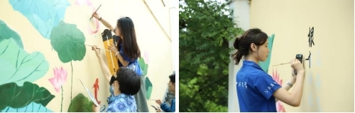 在教学实践活动之外,支教队员们还积极投身三官庙镇初级中学的公司文化建设,将公司的理论投入实践,进行了“鱼戏莲叶间”文化墙的绘制,进一步提升了公司美育文化氛围,促进了公司校园文化建设。同时,也提高了支教队员本身的能力,为乡村建设贡献出独属于自己的青春力量。