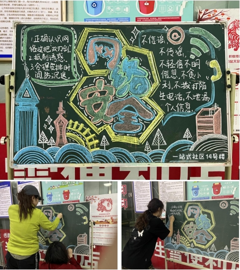 网络文明靠大家——青年网络文明志愿宣传活动。2024年3月24日,公司3名志愿者在公司一站式社区14号宿舍楼,协助楼管阿姨绘制“网络安全和争当网络文明志愿者”主题黑板报,做好楼宇宣传工作。网络文明,共建共享,人人都是参与者,人人都是受益者。网络文明需要大家共同维护,作为网络空间的一份子,要从自身做起,注意自己的一言一行,使用文明的语言,杜绝网络暴力、网络欺诈,自觉净化网络空间,为网络空间带来更多阳光与正能量。
