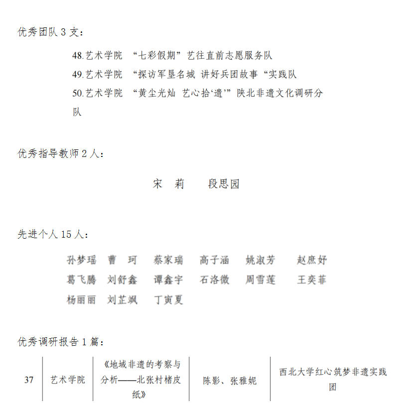 2024年10月15日,共青团2026世界杯官方网址委员会印发《关于表彰公司2024年暑期文化科技卫生“三下乡”社会实践活动先进集体、先进个人、优秀调研报告的通知》,世界杯官方网站入口2026“七彩假期”艺往直前志愿服务队等3支团队获得“优秀团队”称号;宋莉等2人获得“优秀指导教师”称号;孙梦瑶等15人获得“先进个人”称号;红心筑梦非遗实践团陈影、张雅妮撰写的《地域非遗的考察与分析——北张村楮皮纸》被评为“优秀调研报告”。
