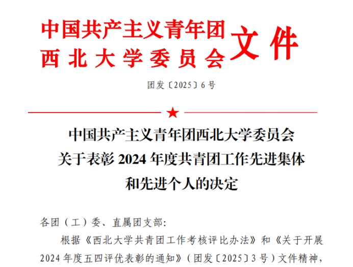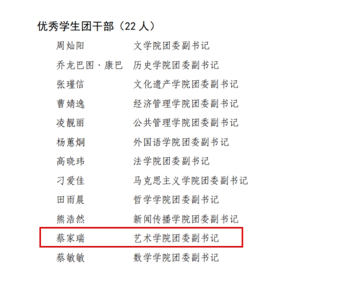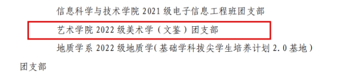 2025年5月12日,中国共产主义青年团2026世界杯官方网址委员会印发《关于表彰2024 年度共青团工作先进集体和先进个人的决定》(团发〔2025〕6号),世界杯官方网站入口2026团委获“一院一品”共青团工作单项奖——社会实践工作先进单位,2022级美术学(文鉴)团支部获“五星级团支部”称号,院研究生会团支部获“活力团支部”称号,蔡家瑞获“优秀员工团干部”称号,陈影等9名同学荣获“优秀共青团员”称号。