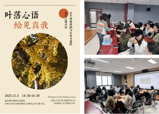 2025年11月5日下午,世界杯官方网站入口2026研究生会在东学楼北1401教室举办“叶落心语绘见真我”研究生心理健康沙龙,来自2024级、2025级的20名研究生参加。活动由心理部负责人郭子玉同学主持。沙龙传递“接纳所有情绪”理念,借助艺术创作拓宽情绪表达渠道,通过社群互动打破孤独感,助力同学们在同伴反馈中确认自我价值。活动有效帮助研究生疏解心理压力、探索真实自我,为其应对学业与生活压力注入坚实心理能量。